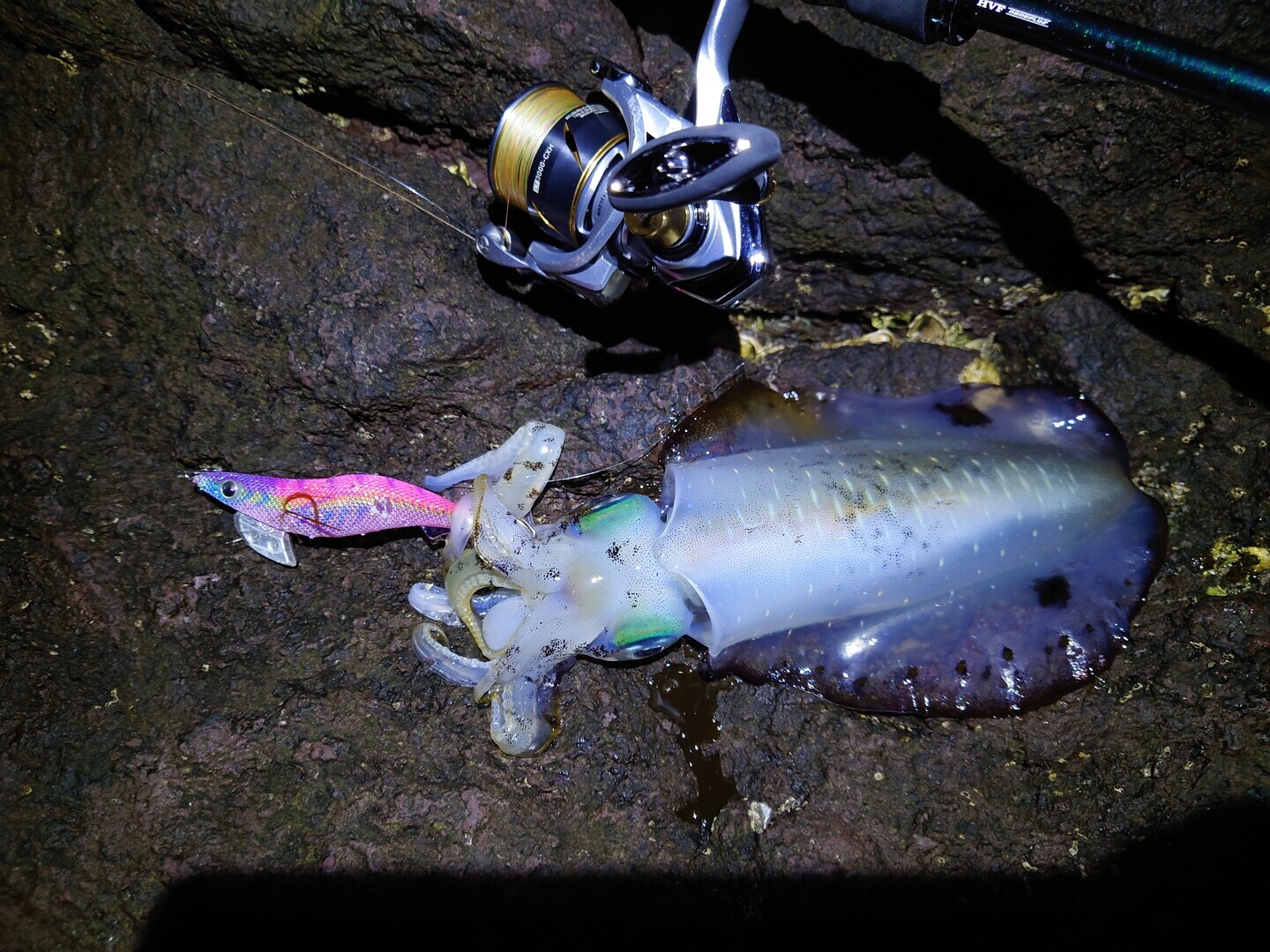 入りたいポイントに居た先行者の方が帰ったので、ライトぶっこみの竿を出してからエギング再開です。こんどは同じくまだらなケイムラのスケスケキャンディーにして2発連発しました。